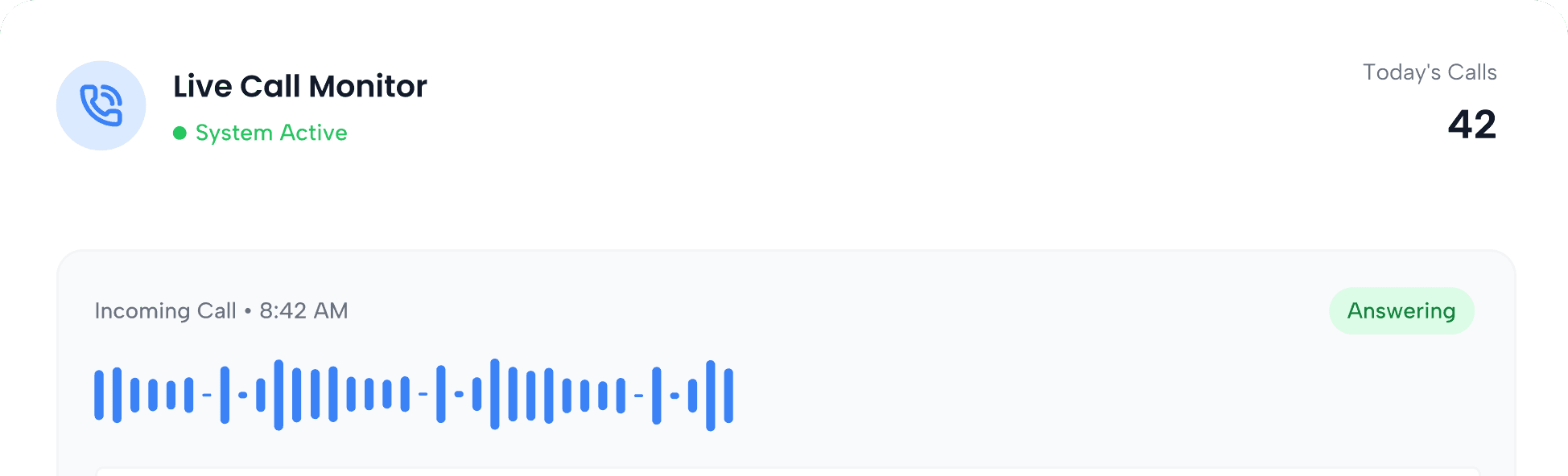 Votre réceptionniste alimenté par l’IA répond à chaque appel — après les heures d’ouverture, pendant les périodes de pointe et lorsque votre équipe est occupée. Captez plus de prospects, planifiez plus de réparations et cessez de perdre des revenus.